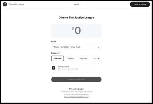 Go to the Crosstowne’s Giving Link select Log in or Sign up in the top right-hand corner of the screen.